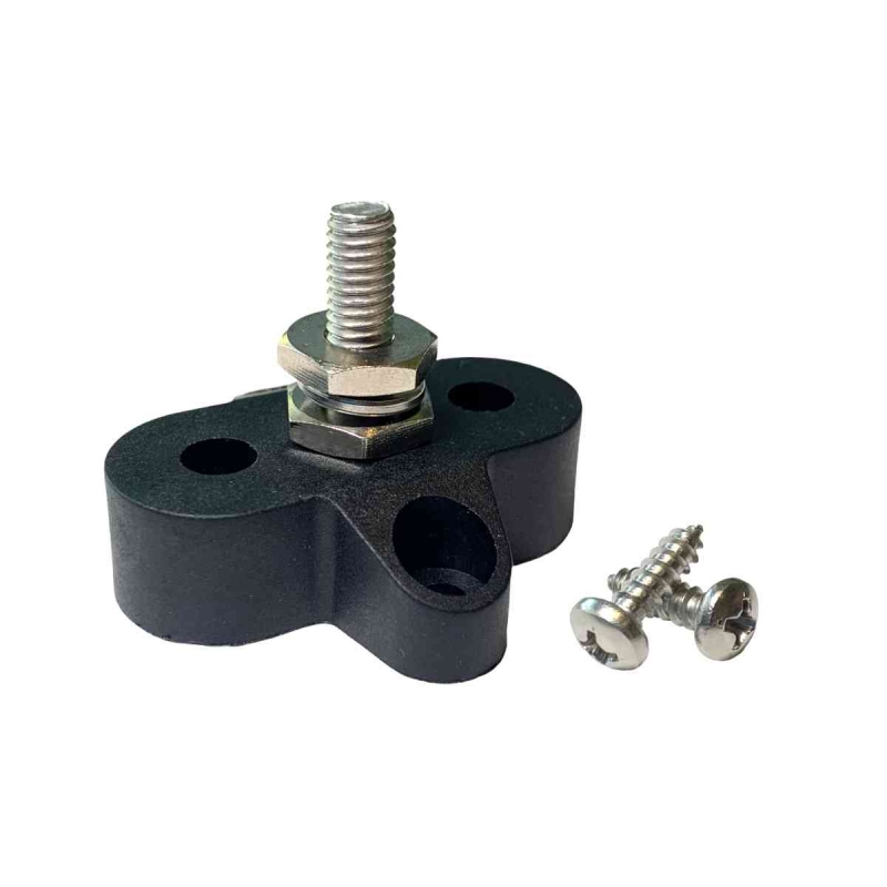 High quality single M6 negative power distribution post with 2 x M4 screws for assembly. Supplied with nut and split ring vibration resistant washer. Suitable for power distribution use in all 12V and 24V applications including boats, mobile homes and campervans.