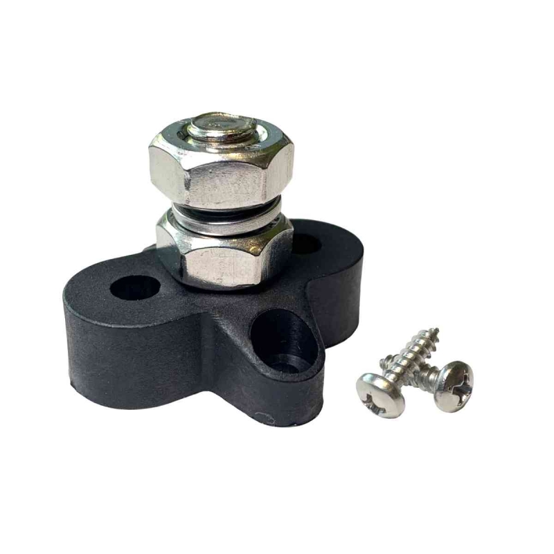 High quality single M10 negative power distribution post with 2 x M4 screws for assembly. Supplied with nut and split ring vibration resistant washer. Suitable for power distribution use in all 12V and 24V applications including boats, mobile homes and campervans.