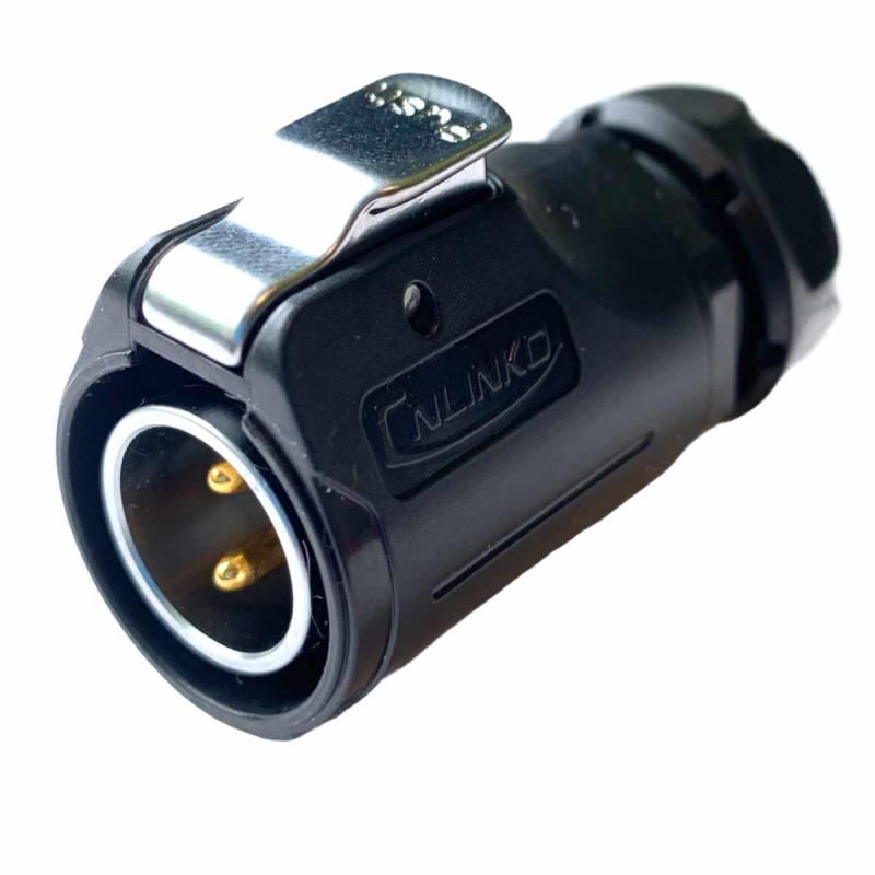 Waterproof circular plug panel mount connector with an IP rating of IP67. This is a locking push in 2 pole connector with solder termination and rear cable gland for 8.5mm-11mm cables. Electrical rating of 20A 500V and carrying UL and CE approval. High quality construction with tough PBT body and gold plated brass contacts.