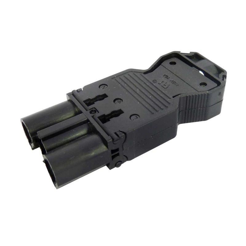 16A 250Vac quick connect male GST connector for lighting applications. Featuring shrouded terminals for safety and pluggable into the matching female connector. Termination is by a traditional screw and clamp terminal block with the outer case snapping together around this. The two halves can be screwed together at the rear which also provides strain relief.