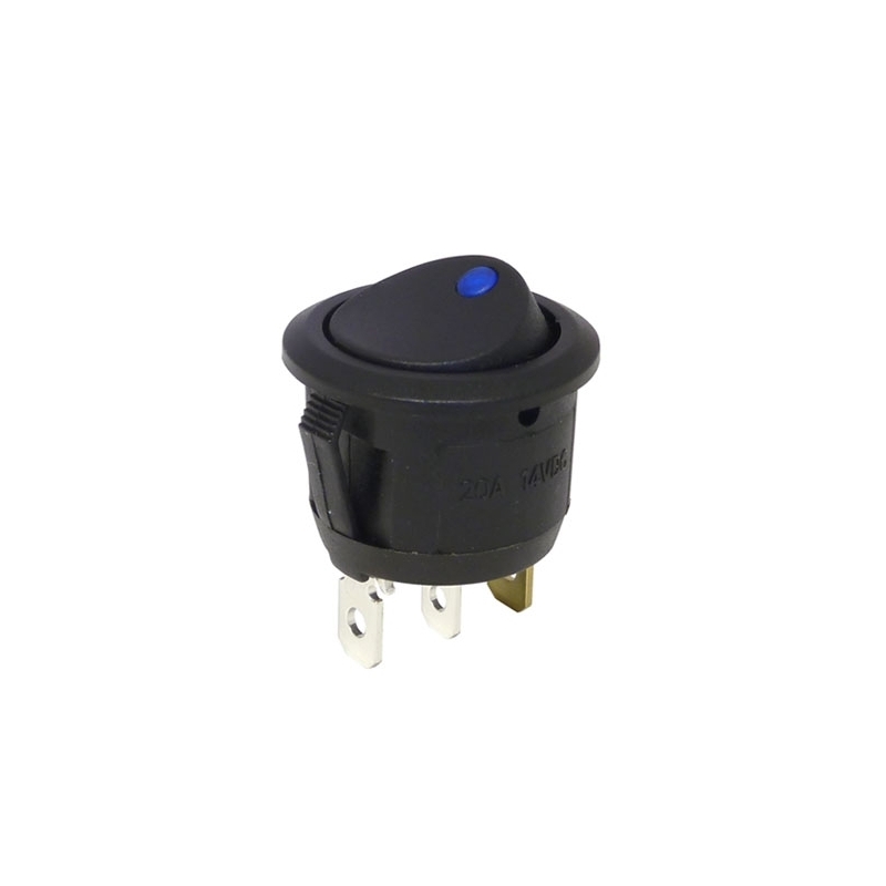 High quality illuminated round rocker switch from leading manufacturer SCI to fit the standard 20mm panel cut out. On Off, single pole single throw (SPST) function. This round rocker switch has a black body and black rocker with a blue illuminated point of light lens. This is a low voltage rocker switch and operates at 12 volts only. Carries ENEC (European) and UL (American) approvals at mains voltages and complies with RoHS.