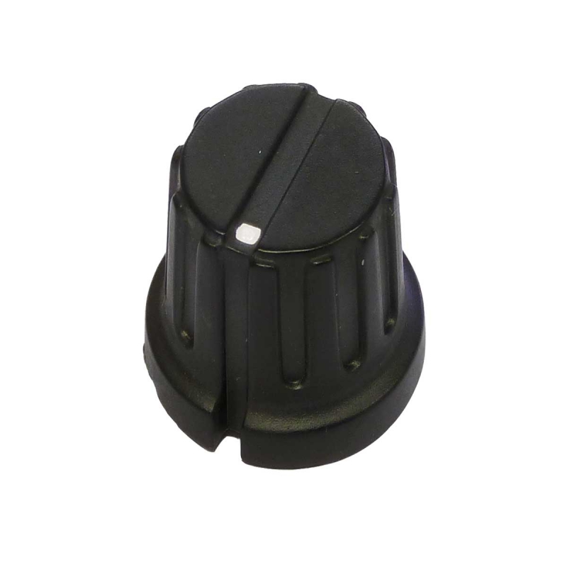 12.3mm Control Knob with 15.5mm Flange / Black Bakelite Body / White Dot Marker / Internal Metal Insert with Grub Screw Fixing (M3) / 6.1mm Shaft Hole for 6mm Shafts / PN-38D.