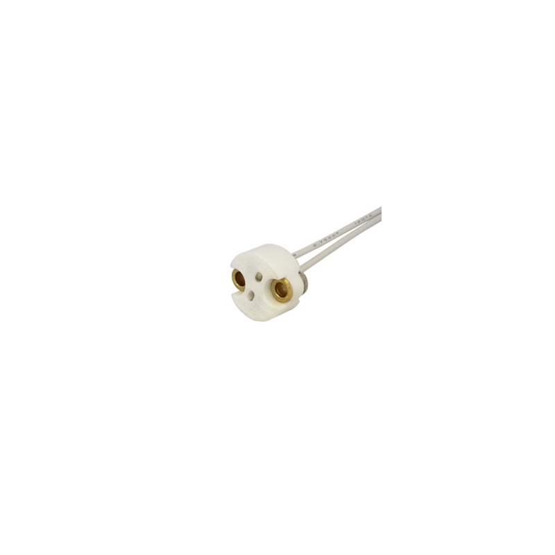 This low voltage lamp holder has a slotted Steatite base and can therefore be used as a GX5.3 lamp holder and GY6.35 lamp holder. Rated at 10A 50V and suitable for up to 100W, ideal for use with low voltage halogen and dichroic lamps. Supplied with 150mm Teflon insulated high temperature wires, stripped to 8mm and suitable for up to 180 degrees celcius.