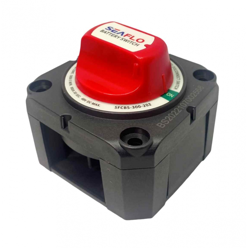 Heavy duty marine battery isolator switch with screw and clamp termination. Removable side break out panels for easy installation. Rated at 300A 32V DC continuous current and 900A 48V DC cranking current with 500A intermittent rating. Switching positions on and off. CE and TUV approved. Waterproof to IP66 and also featuring ignition protection (UL 1500 & SAE J1171).